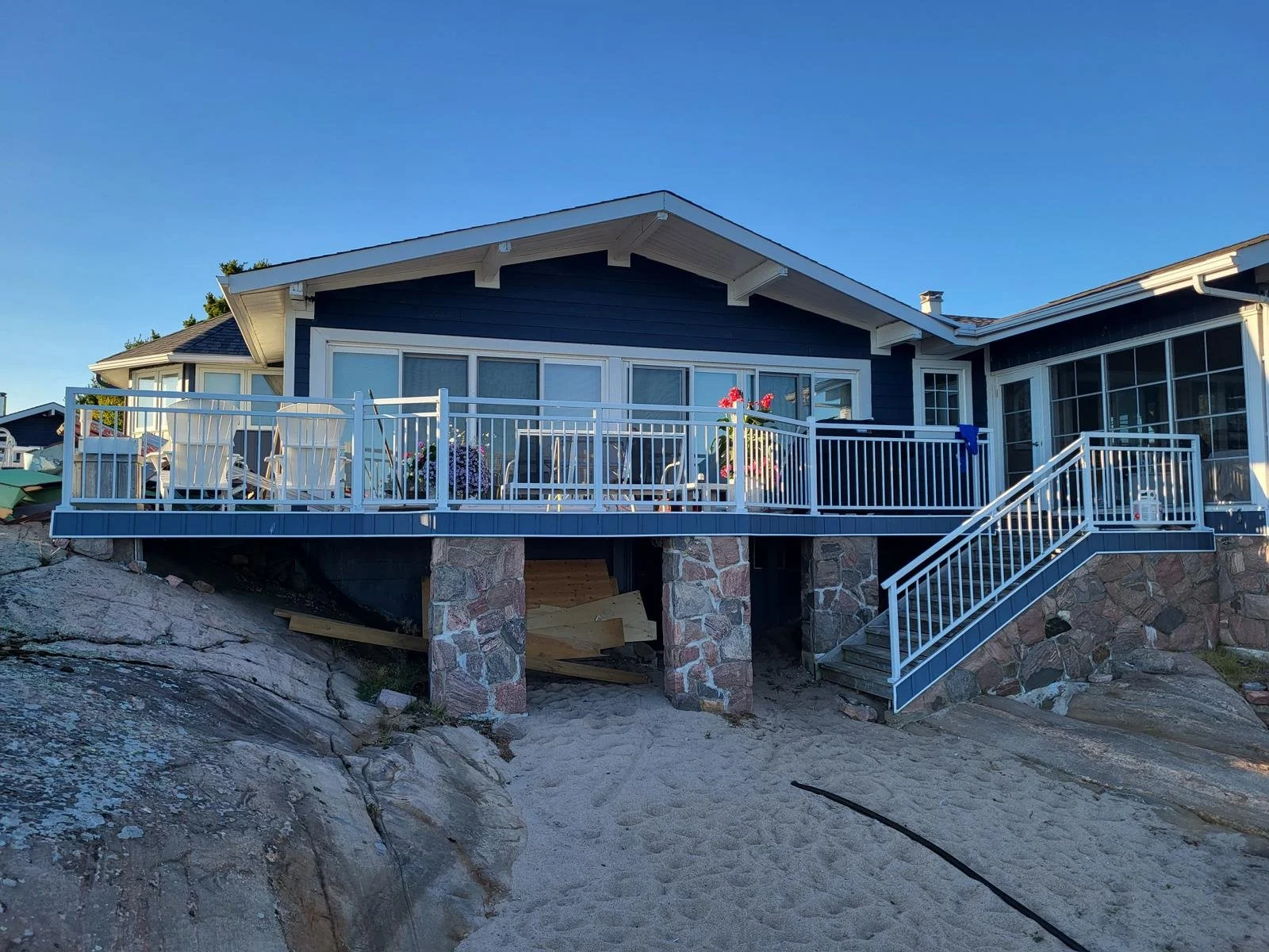 This Georgian Bay cottage underwent a stunning exterior renovation, enhancing its charm and connection to the natural landscape. The fresh blue and white color scheme now mirrors the tranquil hues of the bay, while new siding and trim work offer a crisp, clean finish. Careful craftsmanship ensured that the updates not only modernized the appearance but also maintained the cozy, welcoming feel of this lakeside retreat.